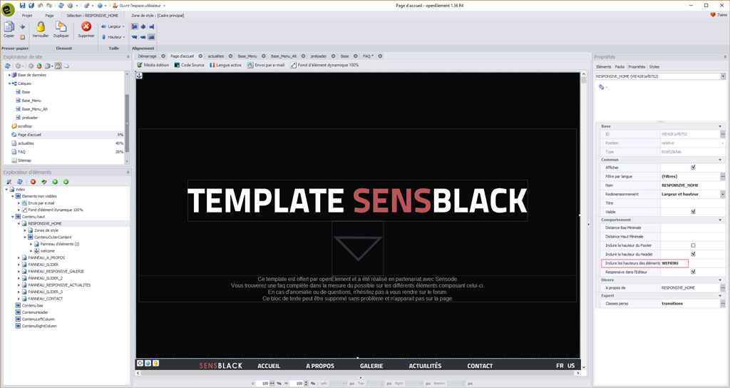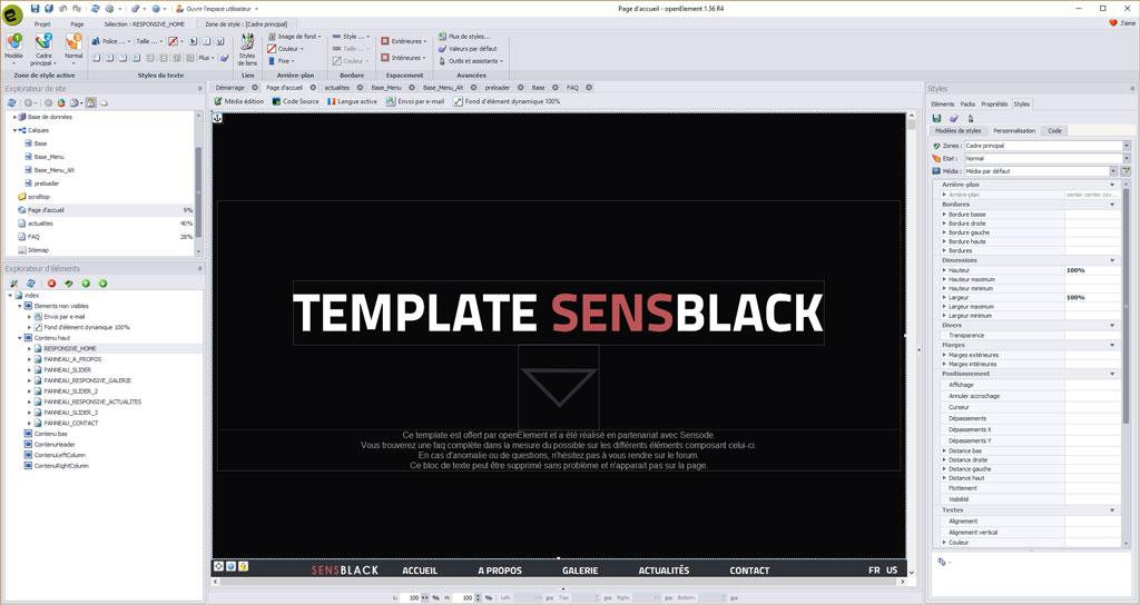 Comme vous pouvez le voir, le template SENSBLACK comporte de tous nouveaux éléments ainsi que du code spécialement développé et intégré au mieux dans Openelement.